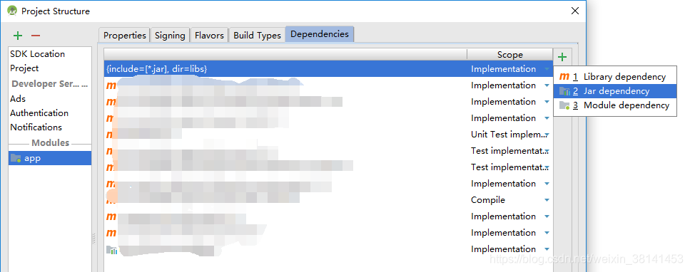 导入时将jar包放入模块下libs文件夹中,右键->Add As Library或者在File->Project Structure中添加,如图所示: